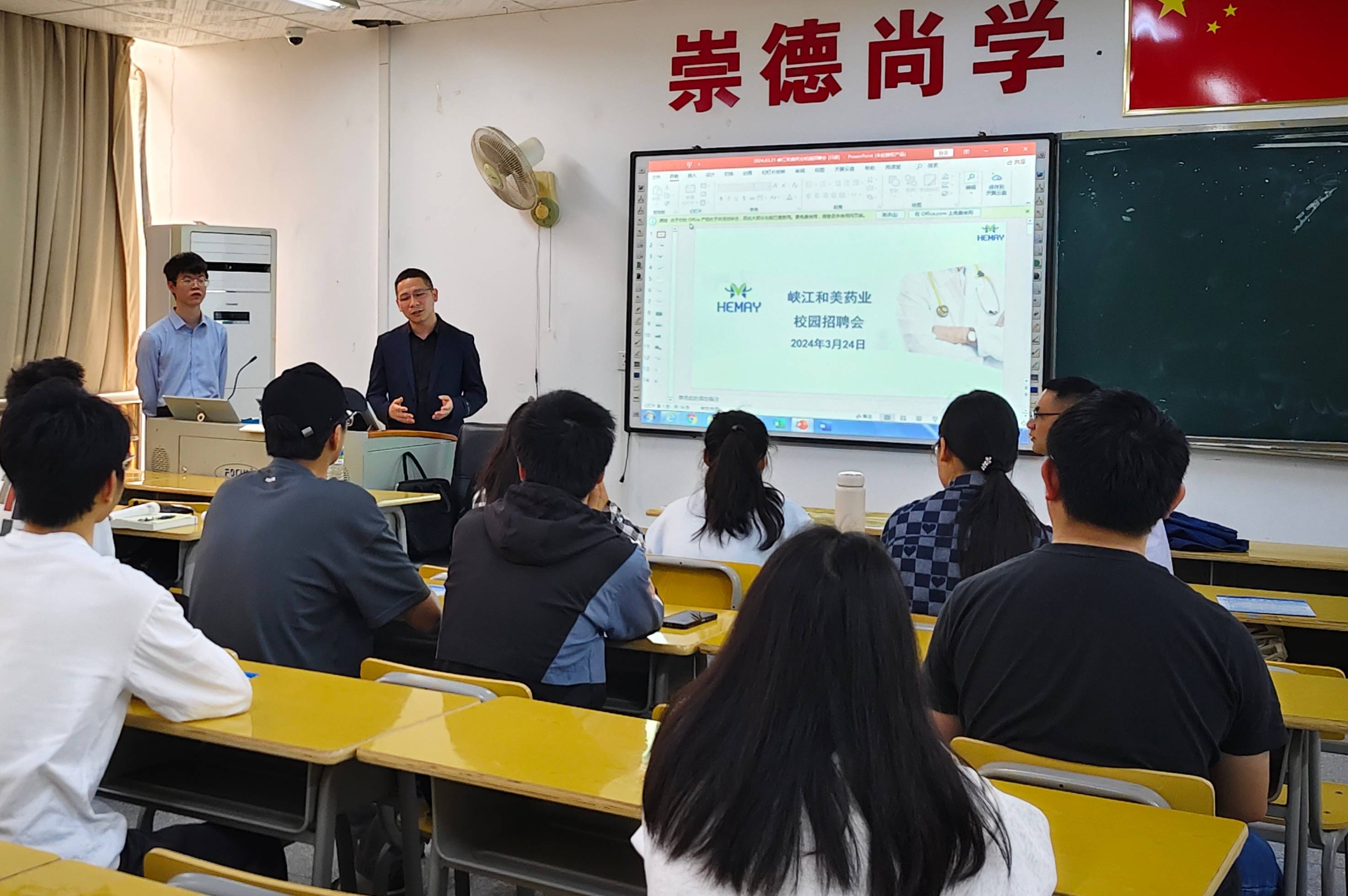 3月24日上午,峡江和美药业有限公司在化学楼305教室举办毕业生校园专场招聘宣讲会。之后该公司总经理助理、我院2012届应用化学专业优秀校友杨宇飞,还以“从赣师走向和美”为题给现场的师弟师妹们作了关于他在赣师的求学时光以及从校园走向工作岗位的就业育人讲堂。