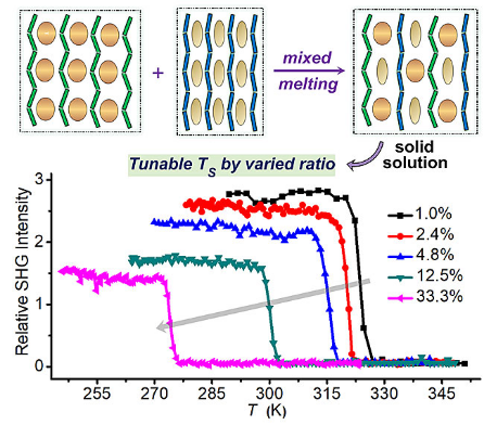 该研究工作通过调控有机铵阳离子的结构,构筑出两种结构相似的可熔化配位聚合物。变温倍频测试表明,改变两种化合物的组成比例,可以获得“开/关”温度在273-328 K范围内可调的分子基固溶体。通过变温单晶结构分析和分子动力学模拟详细地研究了化合物1的倍频效应“开/关”功能的内在机制,研究结果为分子开关的设计提供了实验支撑。