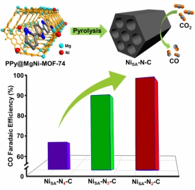 在该研究中,作者提出了一种新型通用的主-客体协同保护策略制备SACs,首次选择不含N的双金属MgNi-MOF-74作为前驱体,引入Mg 延长了相邻Ni 原子的空间距离。此外,在MOF孔道中引入聚吡咯(PPy)分子作为N 源,以稳定热解过程中分离的Ni 原子,通过调节热解温度,获得了一系列N 配位数不同的单原子Ni 催化剂。采用这种策略也制备了单原子Fe和Co 催化剂。电催化CO2 还原测试表明,具有最低的N配位数的NiSA-N2-C表现出最好的CO2电还原到CO性能,其法拉第效率为98%。理论计算表明,NiSA-N2-C中单原子Ni 位点的低N配位数有利于形成COOH*中间体,从而表现出更好的活性和选择性。