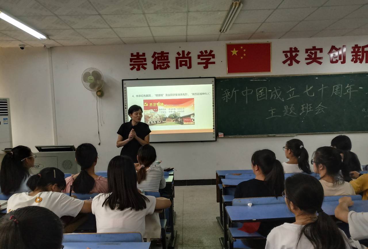 该院党委书记李坊贞在化学楼305教室参加化学1802班“庆祝中华人民共和国成立70周年”主题班会,观看爱国主义教育纪录片,旁听《分析化学》课程,并为同学们上了一堂题为“传承红色基因,坚定理想信念”的思政课。她寄语同学们坚定理想信念,在人生道路上坚强乐观地追逐梦想。