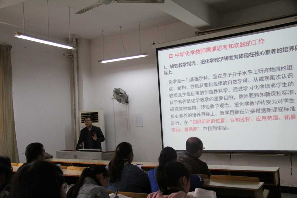 为开展好化学专业本科生教育见习和教育研习教学环节。3月29日下午,化学化工学院邀请江西省上犹中学徐新钡在化学楼204教室作了一场《中学教学策略和高考化学试题研究》的专题讲座。全院200余名化学师范专业的学生和没有教学任务的教育硕士导师及部分青年教师听取了讲座。