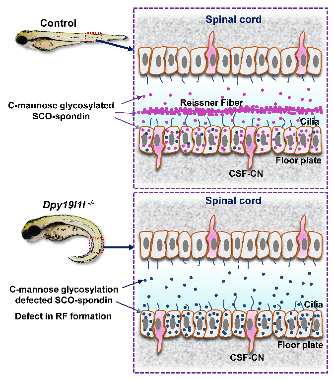 该研究以斑马鱼为模式生物,阐明了糖基转移酶DPY19L1L通过糖基化修饰SCO-spondin蛋白TSR区域,促进赖斯纳氏纤维(RF)形成并维持正常体轴形态的分子机制。特发性脊柱侧弯(IS)在青少年人群中的发病率大约为1%-3%,该研究为临床上理解特发性脊柱侧弯的发病机制和开发治疗性药物提供了新的见解。