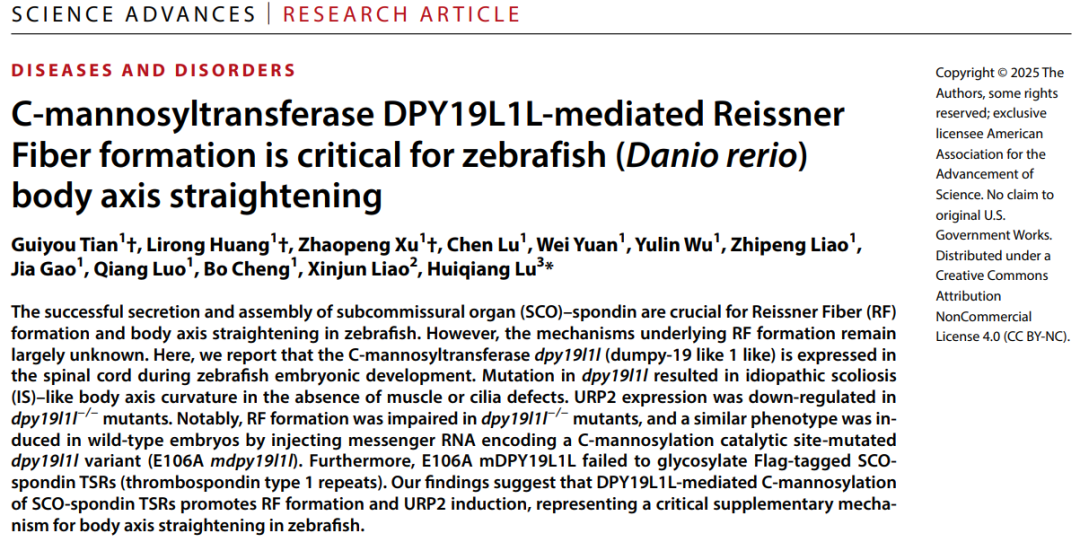 近日,我校以第一完成单位在国际顶级期刊Science子刊《Science Advances》在线发表题为“C-mannosyltransferase DPY19L1L-mediated Reissner Fiber formation is critical for zebrafish (Danio rerio) body axis straightening”的研究论文。