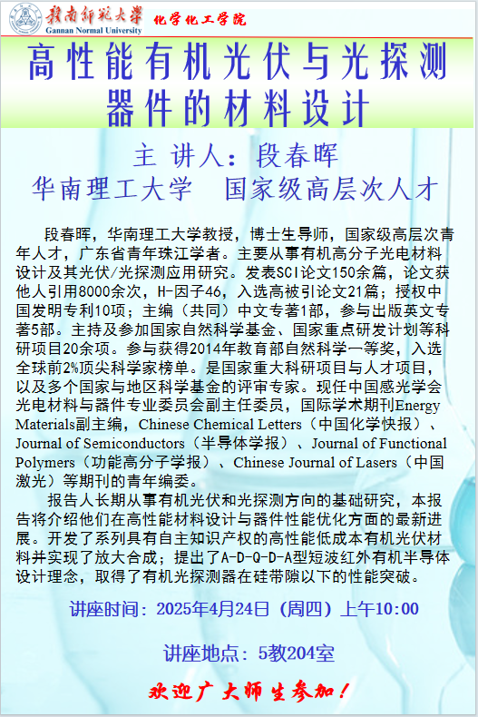 华南理工大学段春晖教授讲座:高性能有机光伏与光探测器件的材料设计